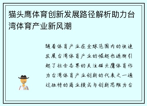 随着体育产业在全球范围内的快速发展,台湾体育产业的崛起也逐渐引起了社会各界的关注。猫头鹰体育作为台湾体育产业创新的代表之一,通过独特的商业模式与创新思维,为台湾体育产业的转型与升级提供了强有力的推动力。本文从四个方面深入分析猫头鹰体育如何通过创新发展路径助力台湾体育产业的新风潮,分别探讨了它在数字化转型、品牌建设、青少年体育推广以及全球化布局等方面的创新举措。这些举措不仅提升了台湾体育产业的核心竞争力,也为其他地区提供了可借鉴的经验。通过分析猫头鹰体育的成功经验,本文旨在为台湾体育产业的未来发展提供一定的参考和启示。