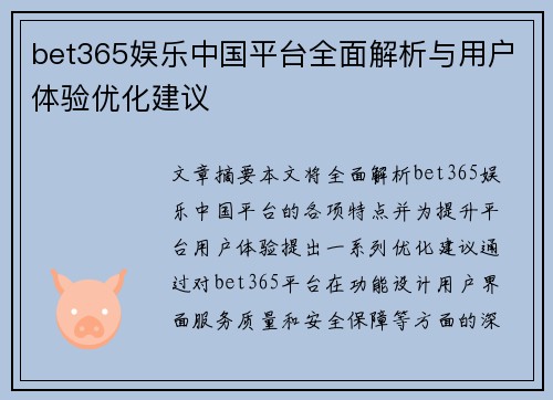 本文将全面解析bet365娱乐中国平台的各项特点,并为提升平台用户体验提出一系列优化建议。通过对bet365平台在功能设计、用户界面、服务质量和安全保障等方面的深入分析,我们将探讨如何进一步提升其在中国市场的竞争力。文章从四个方面进行详细阐述,首先从平台功能和服务内容的全面性入手,其次分析平台的界面设计与用户操作体验,接着讨论bet365在服务质量和客服支持方面的表现,最后重点分析平台的安全性和隐私保护措施。在各个方面的分析基础上,提出相应的优化建议,帮助bet365平台更好地满足中国用户的需求并提升市场份额。最终,通过对全文的总结归纳,明确平台在未来发展的方向和潜在的改进空间。