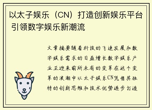 随着科技的飞速发展和数字娱乐需求的日益增长,数字娱乐产业正迎来前所未有的变革。在这个变革的浪潮中,以太子娱乐(CN)凭借其独特的创新思维和技术优势,逐步打造出一个具有深远影响力的创新娱乐平台。本文将从四个方面详细探讨以太子娱乐(CN)如何通过整合先进技术、创新内容、用户体验优化和市场趋势引领,推动数字娱乐产业的未来发展。首先,我们将讨论该平台如何利用区块链、人工智能等前沿技术提升娱乐内容的生产与流通效率。其次,分析其在内容创作上的突破,如何通过丰富多元的原创内容吸引用户。接着,我们将探讨以太子娱乐在用户体验方面的优化措施,如何通过精准的用户需求分析提高用户黏性。最后,本文还会分析其在全球化布局中如何借势发展,并根据行业趋势进行预测。最终,通过这些角度的综合分析,本文将展示以太子娱乐(CN)如何在数字娱乐领域引领新潮流,并成为行业发展的重要推手。